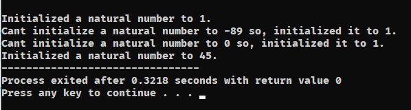 //adt of type NaturalNumberclass NaturalNumber{ int number ; public: //constructors NaturalNumber(){ number = 1 ; cout << "\nInitialized a natural number to 1." ; } NaturalNumber(int a){ if(a > 0){ number = a ; cout << "\nInitialized a natural number to " << a<< "." ; }else{ number = 1 ; cout << "\nCant initialize a natural number to "<< a << " so, initialized it to 1."; } } //methods int increment(){ return ++number ; } int decrement(){ if(number > 1){ return --number ; }else{ cout << "\nCannot decrement below 1." ; return 1 ; } }};main(){ NaturalNumber a ; NaturalNumber b(-89) ; NaturalNumber c(0) ; NaturalNumber d(45) ;}